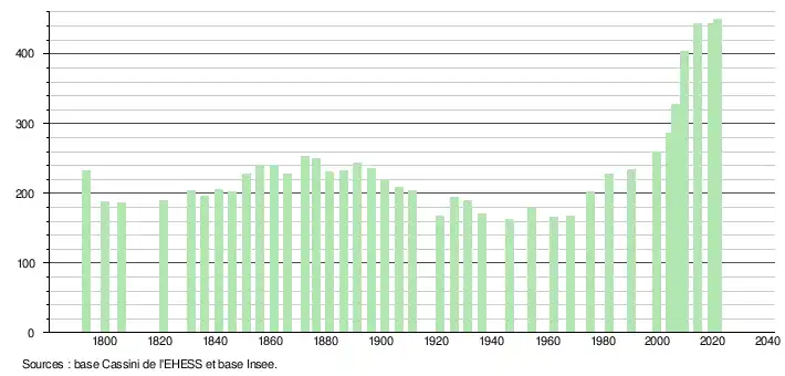 L'évolution du nombre d'habitants est connue à travers les recensements de la population effectués dans la commune depuis 1793. Pour les communes de moins de 10 000 habitants, une enquête de recensement portant sur toute la population est réalisée tous les cinq ans, les populations légales des années intermédiaires étant quant à elles estimées par interpolation ou extrapolation[19]. Pour la commune, le premier recensement exhaustif entrant dans le cadre du nouveau dispositif a été réalisé en 2004[20].