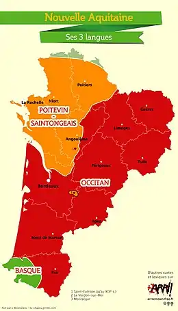 Le poitevin-saintongeais est parlé sous ses variétés poitevin ou saintongeais[18] essentiellement dans cinq départements de la région Nouvelle-Aquitaine (deux-tiers ouest de la Charente, Charente-Maritime, Deux-Sèvres, Vienne et nord de la Gironde — Pays Gabay du Blayais et du nord-Libournais), dans la Vendée, dans le sud de la Loire-Atlantique (Pays de Retz), dans quelques communes d'Indre (vers Le Blanc, Bélâbre, Argenton-sur-Creuse), ainsi que de façon plus anecdotique dans l'extrême ouest de la Dordogne aux alentours de La Roche-Chalais[19], et sur le bord du département de Lot-et-Garonne proche de l'enclave saintongeaise de Monségur en Gironde, ainsi qu'autrefois à la pointe de Grave[19]; en somme, dans les anciennes provinces du Poitou, de l'Aunis, de l'Angoumois et de la Saintonge, en France[20].