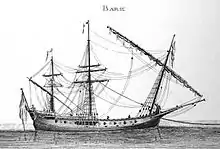 ![]() Polacre (David Steel, 1794) - Observez le gréement en trois-mâts carrés et voile latine sur l'artimon. |