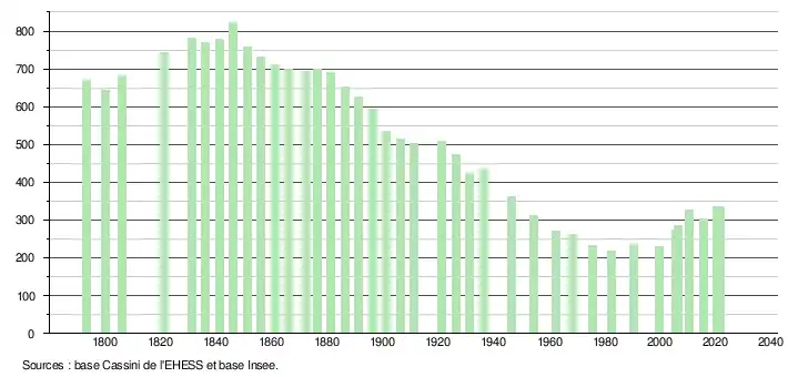 L'évolution du nombre d'habitants est connue à travers les recensements de la population effectués dans la commune depuis 1793. Pour les communes de moins de 10 000 habitants, une enquête de recensement portant sur toute la population est réalisée tous les cinq ans, les populations légales des années intermédiaires étant quant à elles estimées par interpolation ou extrapolation[19]. Pour la commune, le premier recensement exhaustif entrant dans le cadre du nouveau dispositif a été réalisé en 2005[20].