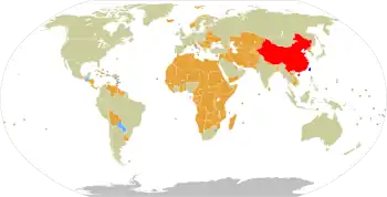 Depuis les années 1970, la république populaire de Chine et la république de Chine se sont disputé la reconnaissance diplomatique des autres nations, souvent en offrant une aide financière aux pays les plus pauvres en contrepartie[50],[51]. En tant que condition préalable à l'établissement de relations diplomatiques, la république populaire de Chine exige de l'autre pays qu'il renonce à la reconnaissance de la république de Chine. Depuis l'introduction de la politique de « diplomatie pragmatique » (務實外交, Wùshí wàijiāo) en 1991, la république de Chine n'insiste plus pour être considérée comme l'unique représentant de la Chine et n'a pas demandé aux nations qui la reconnaissent de mettre fin à leurs relations avec la RPC[52]. Par exemple, lorsque Sainte-Lucie a reconnu la république de Chine en 2007, son chef a exprimé l'espoir que ses relations avec la RPC se poursuivraient[53]. Cependant, la république populaire de Chine a répondu à ce changement en suspendant ses relations avec Sainte-Lucie[52]. Seize États membres des Nations unies et le Saint-Siège ont officiellement reconnu la RDC.