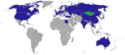 Depuis que la Mongolie a déclaré son indépendance, des tentatives ont été faites pour briser cette dépendance en intensifiant les relations bilatérales et multilatérales avec les pays du monde occidental. Dans un acte d'équilibre, les connexions dans le domaine culturel, politique et économique doivent être maintenues sans mettre en danger les bonnes relations avec les deux pays voisins. Outre les États-Unis et les États de l'Union européenne, le Japon est également devenu un pays partenaire privilégié[10]. En outre, la Mongolie est impliquée dans de nombreuses organisations internationales, telles que l'Organisation pour la sécurité et la coopération en Europe, l'ASEAN et la Banque mondiale et fournit également des troupes aux missions internationales de maintien de la paix de l'Organisation des Nations unies.