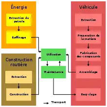 Les impacts concernent l'air, l'atmosphère planétaire, le climat et les microclimats, l'eau, les sols, la flore, la faune et la fonge, l'intégrité écopaysagère, le bruit et la santé publique[4] (principalement des problèmes pulmonaires et cardiovasculaires[5]). L'exposition à la pollution particulaire automobile, comme le tabagisme, est un prédicteur de surmortalité[6] et de cancer de l'enfant[7].