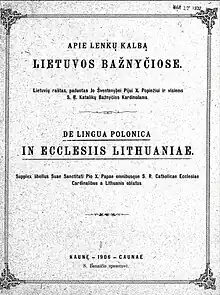 L'émergence du renouveau national lituanien dans les années 1880 a ralenti le processus de polonisation de la population ethniquement lituanienne, mais a également cimenté un sentiment d'identité nationale parmi une partie importante de la population lituanienne de langue polonaise. Le sentiment d'une identité nationale lituanienne-polonaise à deux vitesses, présent tout au long de la période, a dû céder la place à une déclaration nationale claire. Auparavant, chaque habitant de l'ancien grand-duché de Lituanie était considéré comme un Lituanien, mais face à l'émergence du mouvement national lituanien, qui ne considérait que ceux qui parlaient le lituanien comme des Lituaniens, les résidents de langue polonaise de Lituanie se déclarant de plus en plus souvent Polonais[51]. La querelle sur la langue auxiliaire des offices (polonais ou lituanien) dans les églises de la frontière orientale de la Lituanie ethnique, qui s'est échauffée à partir de la fin du XIXe siècle, a influencé la formation de la conscience polonaise et l'adoption du polonais parmi les croyants dont les ancêtres avaient abandonné le lituanien pour le « parler simple »[52].