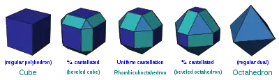 t0,2{p,q} | En ajout à la troncature des sommets, chaque arête originale est rabotée faisant apparaître à la place de nouvelles faces rectangulaires. Un biseautage uniforme est à mi-chemin entre le parent et les formes duales.![]() | ||