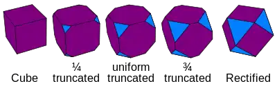 | Tronqué | t0,1{p,q} | Chaque sommet original est découpé, avec de nouvelles faces remplissant le trou. La troncature possède un degré de liberté, qui a une solution qui créée un polyèdre uniforme tronqué. Le polyèdre a ses faces originales doublées par côtés, et contient les faces du dual.![]() | ||