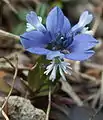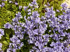 Les fleurs, d'un centimètre environ, sont irrégulières, bleu-gentiane, rarement roses ou blanches. Le calice est formé de 5 sépales colorés, deux sépales pétaloïdes formant des ailes et trois petits, triangulaires, dont un est placé entre les deux plus grands. Les pétales sont soudés et peu développés. Les 8 étamines sont soudées et forment deux faisceaux réunis en Y. ; leurs anthères, en partie fendues, sont roses ou blanches.