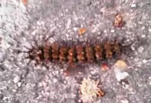 La chenille est marron rougeâtre, ornée d'épines mais sa couleur peut varier[2].