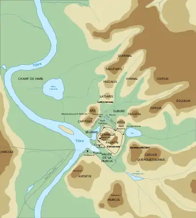 Le mur d'enceinte de la ville ne marque pas la limite du pomerium, pas plus que ni le pomerium, ni le mur d’enceinte ne marquent la limite de la ville habitée[10]. Le pomerium est signalé par des cippes à chaque fois que le tracé change de direction. La distance précise entre chaque cippe est indiquée sur le cippe lui-même en pieds, et tous les cippes sont numérotés dans l’ordre dans lequel ils sont disposés le long de la ligne pomériale[81]. Le pomerium aurait été successivement agrandi trois fois avant la fin de la République, puis au moins deux fois durant l’Empire, seuls les agrandissements menés par Claude et Vespasien sont certains[82].