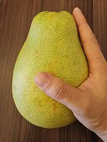 Gros fruit entre 400 et 600 g[12], conique ou pyriforme à peau jaune-vert clair. Pulpe blanche légèrement jaunâtre parfois légèrement rosée. Quelques graines. Le gout est doux, la texture juteuse avec une pointe d'amertume, on compte 12 et 16 segments aux membranes carpellaires fines mais résistantes qui doivent être éliminées. Les fruits produits par des vieux arbres (arbre de 20 à 30 ans) sont réputés les plus délicieux[2]. La maturité est mi-septembre, pour la Fête de l'Automne.
