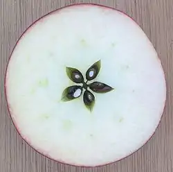 La pomme est un faux-fruit ou fruit composé de cinq drupes. Elle dérive d'un ovaire infère à cinq loges correspondant à cinq carpelles soudés et fermés en placentation axile. Les graines (pépins) se trouvent dans ces loges dont la paroi correspond à l'endocarpe lignifié des carpelles. La partie charnue comestible correspond au mésocarpe des carpelles et au conceptacle. La peau correspond à l'exocarpe[19].