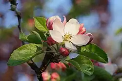 Le pommier est un arbre décidu, mesurant généralement entre 2 et 4,5 mètres de haut en culture, et jusqu'à 9 mètres à l'état sauvage[9]. Lorsqu'il est cultivé, la taille, la forme et la densité de ses branches sont déterminées par la sélection des porte-greffes et la méthode de la taille[9]. Les feuilles sont alternes, ovales, vert foncé, à bords dentelés et au-dessous légèrement duveteux[9]. La floraison a lieu au printemps simultanément avec le bourgeonnement des feuilles et les fleurs sont produites sur des éperons et quelques longues pousses. Ces fleurs de 3 à 4 cm sont composées de cinq pétales blancs avec un teinte rosée qui s'estompe progressivement et leur inflorescence est constituée d'une cyme de quatre à six fleurs. La fleur centrale de l'inflorescence, parfois qualifiée de « floraison royale » s'ouvre en premier et peut développer un fruit plus gros[9],[10].