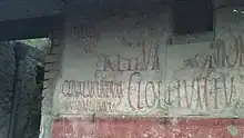 Cette longue période de prospérité s'interrompt avec la guerre[9] menée contre Rome par les cités italiques — dont Pompéi — afin d'obtenir la citoyenneté romaine. En mars 90, les villes samnites se révoltent contre Rome lors de la Guerre sociale. Cette fois, Pompéi se joint à elles. La guerre est dure et les Romains conduits par Sylla prennent Pompéi. Ils donnent l'assaut entre la porte d'Herculanum et la porte du Vésuve. Dans ce secteur, la muraille porte encore les traces des projectiles tirés par les machines de guerre romaines[10]. Il nous reste un autre témoignage du siège de la ville : on a retrouvé à différents endroits des inscriptions en osque — six au total —, appelées inscriptions eituns à cause d'un mot qui s'y retrouve régulièrement[11] et destinées à permettre aux défenseurs de la ville de rejoindre leur poste rapidement sans se perdre au moment d'un assaut.