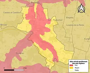 Le retrait-gonflement des sols argileux est susceptible d'engendrer des dommages importants aux bâtiments en cas d’alternance de périodes de sécheresse et de pluie. La totalité de la commune est en aléa moyen ou fort (67,4 % au niveau départemental et 48,5 % au niveau national). Sur les 227 bâtiments dénombrés sur la commune en 2019, 227 sont en aléa moyen ou fort, soit 100 %, à comparer aux 84 % au niveau départemental et 54 % au niveau national. Une cartographie de l'exposition du territoire national au retrait gonflement des sols argileux est disponible sur le site du BRGM[18],[Carte 2].
