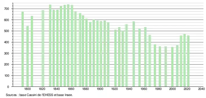 | L'évolution du nombre d'habitants est connue à travers les recensements de la population effectués dans la commune depuis 1793. Pour les communes de moins de 10 000 habitants, une enquête de recensement portant sur toute la population est réalisée tous les cinq ans, les populations légales des années intermédiaires étant quant à elles estimées par interpolation ou extrapolation[24]. Pour la commune, le premier recensement exhaustif entrant dans le cadre du nouveau dispositif a été réalisé en 2006[25]. En 2021, la commune comptait 458 habitants[Note 2], en diminution de 4,58 % par rapport à 2015 (Gironde : +6,88 %, France hors Mayotte : +1,84 %). |