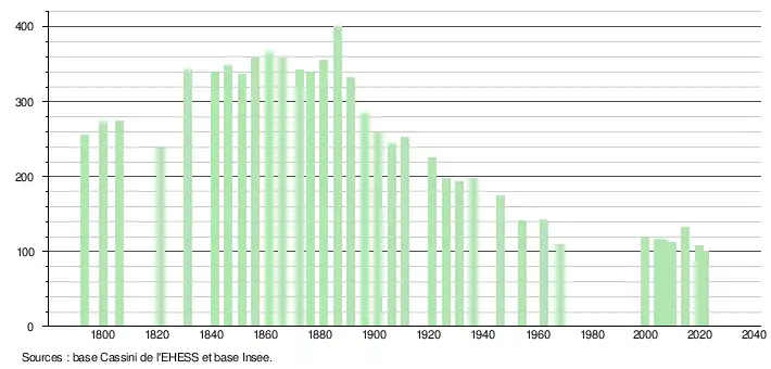 | L'évolution du nombre d'habitants est connue à travers les recensements de la population effectués dans la commune depuis 1793. Pour les communes de moins de 10 000 habitants, une enquête de recensement portant sur toute la population est réalisée tous les cinq ans, les populations légales des années intermédiaires étant quant à elles estimées par interpolation ou extrapolation[21]. Pour la commune, le premier recensement exhaustif entrant dans le cadre du nouveau dispositif a été réalisé en 2004[22]. En 2021, la commune comptait 101 habitants[Note 3], en diminution de 24,63 % par rapport à 2015 (Gers : +0,79 %, France hors Mayotte : +1,84 %). |