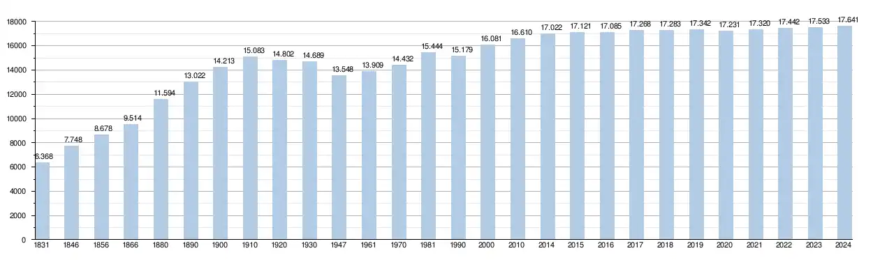 Elle comptait, au , 17 666 habitants (8 615 hommes et 9 051 femmes) [6], soit une densité de 314,90 habitants/km² pour une superficie de 56,10 km²[7].