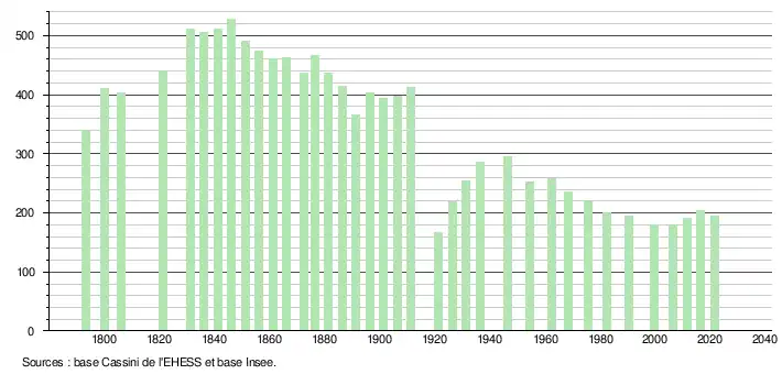 L'évolution du nombre d'habitants est connue à travers les recensements de la population effectués dans la commune depuis 1793. Pour les communes de moins de 10 000 habitants, une enquête de recensement portant sur toute la population est réalisée tous les cinq ans, les populations légales des années intermédiaires étant quant à elles estimées par interpolation ou extrapolation[23]. Pour la commune, le premier recensement exhaustif entrant dans le cadre du nouveau dispositif a été réalisé en 2006[24].