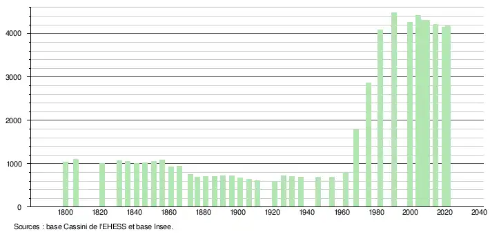 L'évolution du nombre d'habitants est connue à travers les recensements de la population effectués dans la commune depuis 1800. Pour les communes de moins de 10 000 habitants, une enquête de recensement portant sur toute la population est réalisée tous les cinq ans, les populations légales des années intermédiaires étant quant à elles estimées par interpolation ou extrapolation[32]. Pour la commune, le premier recensement exhaustif entrant dans le cadre du nouveau dispositif a été réalisé en 2004[33].