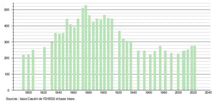 L'évolution du nombre d'habitants est connue à travers les recensements de la population effectués dans la commune depuis 1793. Pour les communes de moins de 10 000 habitants, une enquête de recensement portant sur toute la population est réalisée tous les cinq ans, les populations légales des années intermédiaires étant quant à elles estimées par interpolation ou extrapolation[17]. Pour la commune, le premier recensement exhaustif entrant dans le cadre du nouveau dispositif a été réalisé en 2007[18].