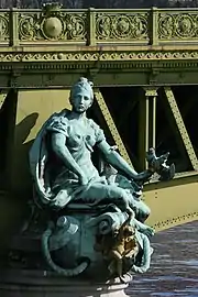 Les deux piles représentent des bateaux. Celui près de la rive droite descend la Seine, tandis que celui de la rive gauche la remonte. Ces bateaux sont ornés de quatre statues allégoriques en bronze de Jean-Antoine Injalbert[2] (nommé officier de la Légion d’honneur lors de l’inauguration) : La Ville de Paris (proue du bateau de la rive droite), La Navigation (poupe), L’Abondance (proue du bateau de la rive gauche) et Le Commerce (poupe). Les deux allégories de proue (Paris et Abondance) font face à la Seine, tandis que les deux allégories de poupe (Navigation et Commerce) font face au pont soit, dos à la Seine.