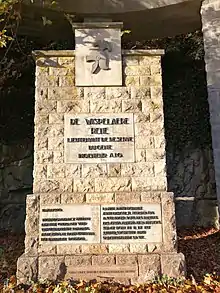 Détail du mémorial en l'honneur du lieutenant de réserve René De Wispelaere, qui a fait sauter le pont au sacrifice de sa vie à l'arrivée des soldats allemands le 12 mai 1940. Œuvre par E. Van Treek, Anvers. Erigé par l'amicale des officiers de Dinant.