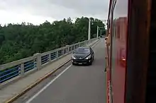 La ligne de chemin de fer est située à l'extrémité est de la route (à l'amont du pont). Pour le transit, le tracé du train est coupé à droite par la route, le passage est protégé par un dispositif de signalisation sans barrière et constitué d'un simple panneau lumineux. Dans le sens inverse, la route n'est pas coupée par le passage du train.