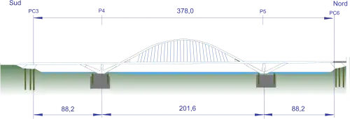 Le pont principal présente une longueur de 378 mètres. Il comprend trois travées de 88,20 m, 201,60 m et 88,20 m. La travée principale est suspendue à un arc incliné situé en rive du tablier par l’intermédiaire de 28 paires de câbles.