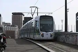 Une rame de tramway de la ligne T3b franchit le pont du canal de l'Ourcq devant les Grands Moulins de Pantin. | |||||