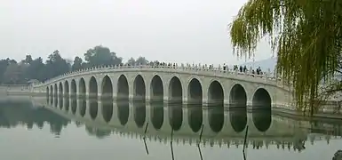 Le pont aux dix-sept arches relie l’île de Nanhu à la rive orientale du lac. Il a aussi été construit durant le règne de l'empereur Qianlong. Avec une longueur de 150 mètres et une largeur de 8 mètres, il est le plus long pont du Palais d'Été.