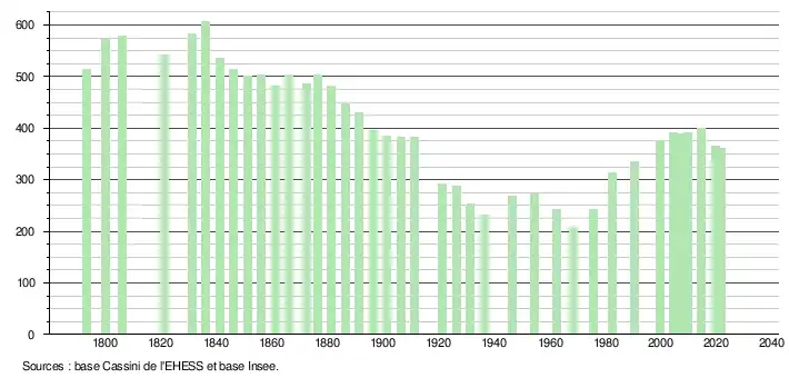 L'évolution du nombre d'habitants est connue à travers les recensements de la population effectués dans la commune depuis 1793. Pour les communes de moins de 10 000 habitants, une enquête de recensement portant sur toute la population est réalisée tous les cinq ans, les populations légales des années intermédiaires étant quant à elles estimées par interpolation ou extrapolation[24]. Pour la commune, le premier recensement exhaustif entrant dans le cadre du nouveau dispositif a été réalisé en 2004[25].