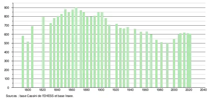 L'évolution du nombre d'habitants est connue à travers les recensements de la population effectués dans la commune depuis 1793. Pour les communes de moins de 10 000 habitants, une enquête de recensement portant sur toute la population est réalisée tous les cinq ans, les populations légales des années intermédiaires étant quant à elles estimées par interpolation ou extrapolation[23]. Pour la commune, le premier recensement exhaustif entrant dans le cadre du nouveau dispositif a été réalisé en 2008[24].