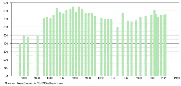 L'évolution du nombre d'habitants est connue à travers les recensements de la population effectués dans la commune depuis 1793. Pour les communes de moins de 10 000 habitants, une enquête de recensement portant sur toute la population est réalisée tous les cinq ans, les populations légales des années intermédiaires étant quant à elles estimées par interpolation ou extrapolation[17]. Pour la commune, le premier recensement exhaustif entrant dans le cadre du nouveau dispositif a été réalisé en 2004[18].
