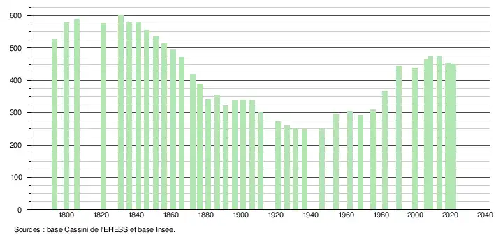 L'évolution du nombre d'habitants est connue à travers les recensements de la population effectués dans la commune depuis 1793. Pour les communes de moins de 10 000 habitants, une enquête de recensement portant sur toute la population est réalisée tous les cinq ans, les populations légales des années intermédiaires étant quant à elles estimées par interpolation ou extrapolation[24]. Pour la commune, le premier recensement exhaustif entrant dans le cadre du nouveau dispositif a été réalisé en 2008[25].