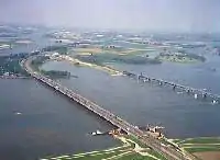 Les ponts de Moerdijk vu depuis le ciel. Le pont routier est à droite, les ponts ferroviaires, à gauche.  | |||