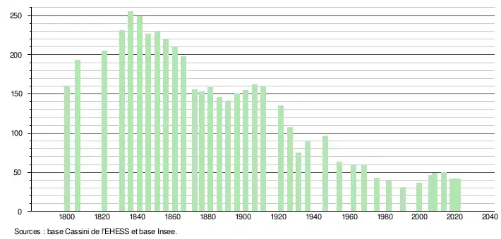 L'évolution du nombre d'habitants est connue à travers les recensements de la population effectués dans la commune depuis 1800. Pour les communes de moins de 10 000 habitants, une enquête de recensement portant sur toute la population est réalisée tous les cinq ans, les populations légales des années intermédiaires étant quant à elles estimées par interpolation ou extrapolation[8]. Pour la commune, le premier recensement exhaustif entrant dans le cadre du nouveau dispositif a été réalisé en 2008[9].