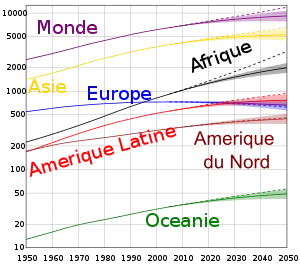 L'ONU a d'abord supposé dans les années 1990-2000[27], et alors que le cap des 6 milliards de terriens était atteint vers 1999[28] que la population pourrait se stabiliser à la fin du XXIe siècle vers 9,5 milliards d'êtres humains (scénario moyen). En 2011, le Département des affaires économiques et sociales de l'ONU a fortement révisé (à la hausse) ses hypothèses et conclusions en termes de projection démographique (2010 Revision of World Population Prospects)[29]. Après une légère réduction des estimations, la dernière projection (2022, scénario moyen) porte la prévision 2100 à 10,4 milliards de personnes ;