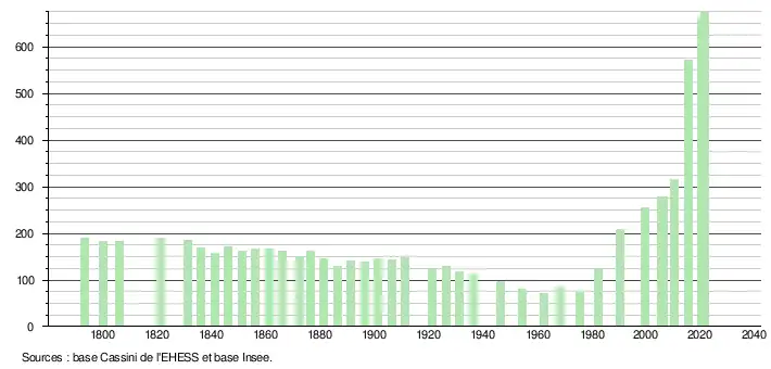 L'évolution du nombre d'habitants est connue à travers les recensements de la population effectués dans la commune depuis 1793. Pour les communes de moins de 10 000 habitants, une enquête de recensement portant sur toute la population est réalisée tous les cinq ans, les populations légales des années intermédiaires étant quant à elles estimées par interpolation ou extrapolation[18]. Pour la commune, le premier recensement exhaustif entrant dans le cadre du nouveau dispositif a été réalisé en 2005[19].