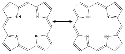 La porphine est un composé organique de formule brute C20H14N4. Il s'agit d'un macrocycle aromatique constitué de quatre pyrroles liés en cercle par quatre ponts méthine. La présence d'atomes de carbone ayant une hybridation sp2 sur toute la circonférence du macrocycle forme un système conjugué de doubles liaisons qui confère à l'ensemble de la structure son caractère aromatique. La résonance de la porphine peut être représentée par le diagramme ci-dessous :