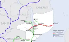 Le chemin de fer de Nacala relie Moatize (ouest du Mozambique et Chipata, en Zambie, via le Malawi, au port de Nacala. Le système ferroviaire relie également Nampula, Malema et Cuamba. À Cuamba, existe un embranchement qui mène au nord-ouest du Mozambique jusqu'à Lichinga.