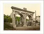 La double porte, comme son nom l'indique, se dresse avec trois demi-colonnes corinthiennes entre et de chaque côté des deux arches. Les colonnes supportent un entablement avec sa frise et sa corniche, mais l'architrave manque [6]. La couronne en relief de la corniche relie l'ensemble en un tout harmonieux.