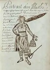 « Portrait d'un Illustre borgne: ce Capitaine eut un œil crevé d'un coup de fleche. Il a Esté grand guerrier et terreur de diverses Nations du linage de son pais. Il hasrangue ses soldats autravers d'un tube descorse de bouleau. Il les exorte a lescouter, leur disant pissintaouik Nikanissitik. escoutes moy mes freres. Il sapelloit Iscouakité qui veut dire le tison allumé. »