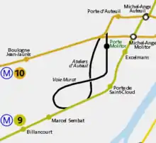 Les stations Porte de Saint-Cloud et Porte d'Auteuil sont reliées d'une part par les voies des ateliers d'Auteuil et d'autre part par une voie unique située sous le boulevard Murat. Une station à quai central se trouve sous celui-ci. Elle s'appelle donc Murat ou Porte Molitor.