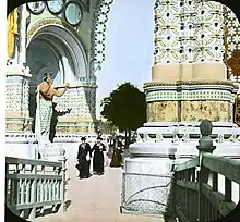 La teinte générale du monument est d’un blanc crème, mais toutes ses parties sont revêtues d’une décoration polychrome avec des tons rouges dorés et noirs lui donnant un aspect à la fois luxueux et artistique. Cette décoration comporte 3 116 lampes à incandescence de formes et de couleurs variées[3]. Il y a outre, 12 lampes à arc sur la coupole et les minarets, 8 lampes à réflecteurs-projecteurs, et 16 lampes à réflecteurs simples sur les pylônes[3],[4].