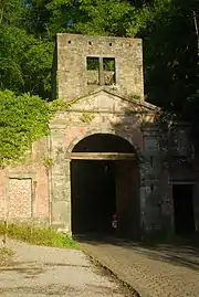 La Porte de Namur se dresse à côté des ruines de l'abbaye de Villers-la-Ville, non loin du Syndicat d'Initiative.