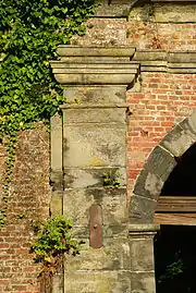 Les pans de façade situés de part et d'autre de la porte présentent, à gauche, une baie rectangulaire aveugle à encadrement de pierre dont le linteau est orné d'une clé et, à droite, une porte qui donne accès à l'intérieur en ruines de l'édifice.