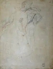 En 1964, le dessin est remonté en vue de sa présentation inaugurale à l'exposition Masterpieces of the Print Room de 1965 au British Museum[6]. Le retrait de la monture a révélé un croquis à la craie rouge et noire d'un homme barbu avec un chapeau debout à côté d'une femme et d'un petit enfant. Cette esquisse est à l'envers par rapport à la face avant.
