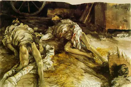 Trois soldats tombés dans une grange, 1866 ; crayon, aquarelle, Kupferstichkabinett Berlin.