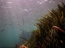 Les poissons sont, quant à eux, représentés par les Labridés et Sparidés, presque tous carnivores. On trouve peu de grands poissons, et pendant l'année on assiste à des variations dans l'abondance de ceux-ci dû aux migrations et l'ajout d'individus d'autres régions. Dans les herbiers superficiels on trouve beaucoup d'exemples de saupes (Sarpa salpa), un herbivore (quasiment le seul de sa famille) représentant de 40 à 70 % des poissons présents dans les herbiers en été[26], et qui se nourrit des feuilles de posidonies et de la faune épiphyte qui les colonise. On y trouvera également des labres (notamment le mimétique Labrus viridis), crénilabres, rascasses, serrans (Serranus scriba), jeunes congres (Conger conger), hippocampes ou encore syngnathes (comme Nerophis maculatus et Syngnathus typhle, parfaitement mimétique des feuilles de posidonies)[19] et des « porte-écuelle » comme Apletodon incognitus et Opeatogenys gracilis, ce dernier étant lui aussi mimétique des feuilles de posidonies.