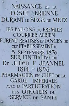 Les deux premiers ballons postaux sont lancés entre le 5 et le à Metz[1]. C’est la naissance de la poste aérienne (première poste aérienne de Metz également appelée poste des pharmaciens ou papillons de Metz) qui est l’œuvre du pharmacien militaire Julien-François Jeannel et du docteur Papillon[2]. Entre le 5 et le , ce sont quatorze ballons qui sont lancés depuis l’hôpital militaire du Fort Moselle (principalement des courriers d’officiers)[3]. Ces ballons ont transporté environ 3 000 dépêches[4].